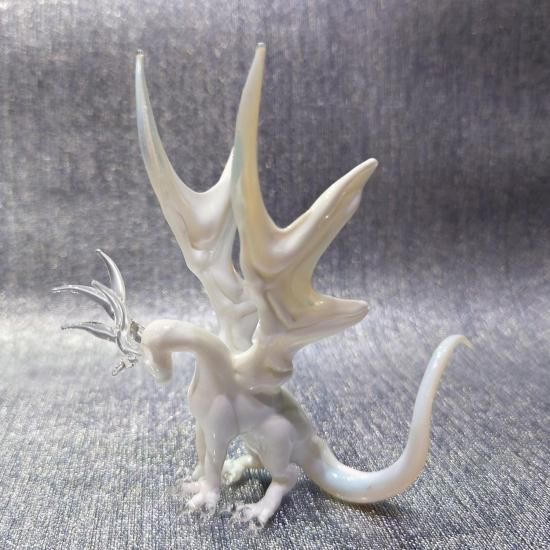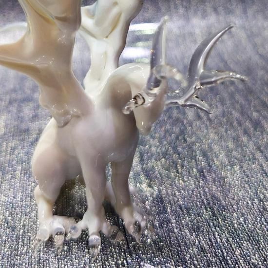 美しい透明な鹿角を持つ白いドラゴンのガラス置物「White dragon with antlers」が登場しました。この置物は、透明ガラスで作られた角や爪が、まるで生きているかのようなリアルな存在感を引き立てます。ドラゴンの身体は不透明な白いガラスで造形されており、関節や筋肉のディテールまでこだわり抜かれています。